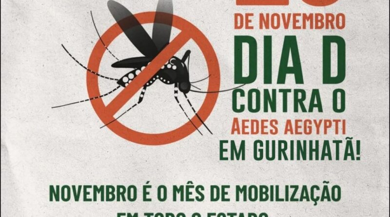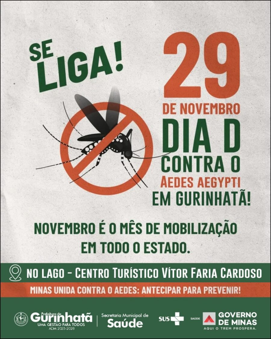 A Prefeitura de Gurinhatã, por meio da Secretaria de Saúde e do Departamento de Endemias, promove no próximo sábado, 29 de novembro, o Dia D de Combate à Dengue, em uma ação especial de mobilização e conscientização da população. O evento será realizado às margens do lago, logo após a chegada do Passeio Ciclístico, que encerrará suas atividades no local.