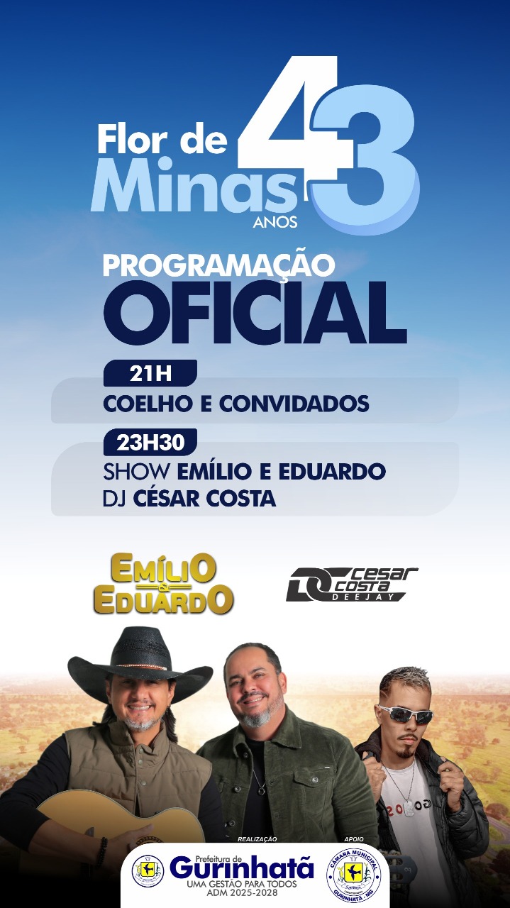 “Nosso distrito merece o melhor, por isso estamos trazendo para essa festa o show do Emílio e Eduardo para comemorar junto com a nossa população essa data tão importante”, comentou o prefeito de Gurinhatã, Douglas Valente.